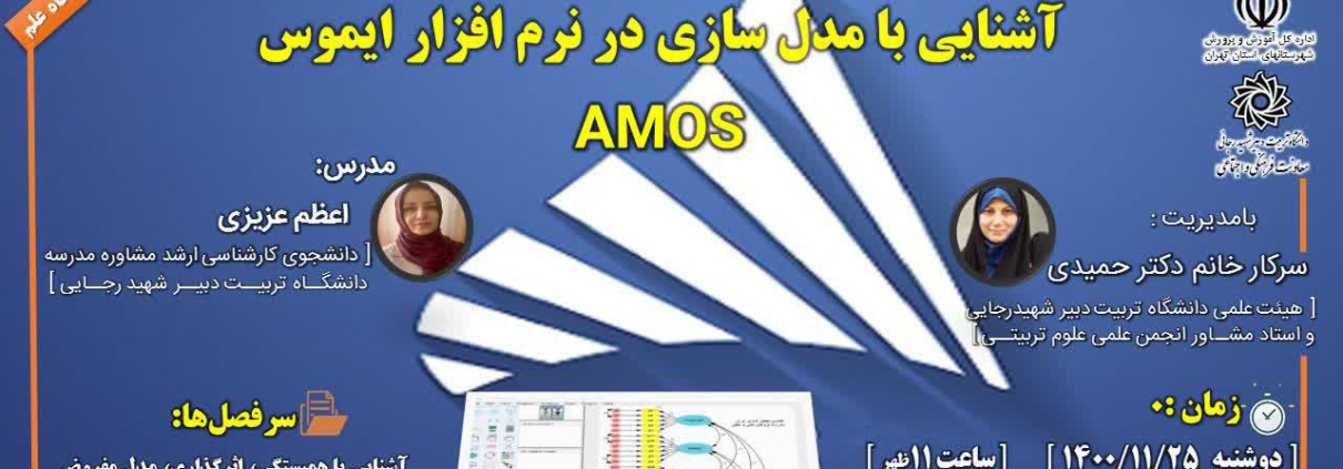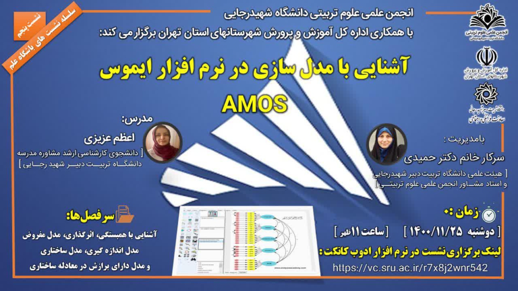 معاونت فرهنگی و اجتماعی خبر داد؛ به همت انجمن علمی علوم تربیتی دانشگاه و همکاری اداره کل آموزش و پرورش شهرستان های استان تهران، وبینار آموزشی ” آشنایی با مدل سازی در نرم افزار AMOS ( ایموس)” توسط خانم دکتر اعظم عزیزی، برگزار می گردد. زمان : دوشنبه ۲۵ بهمن ماه ، ساعت ۱۱