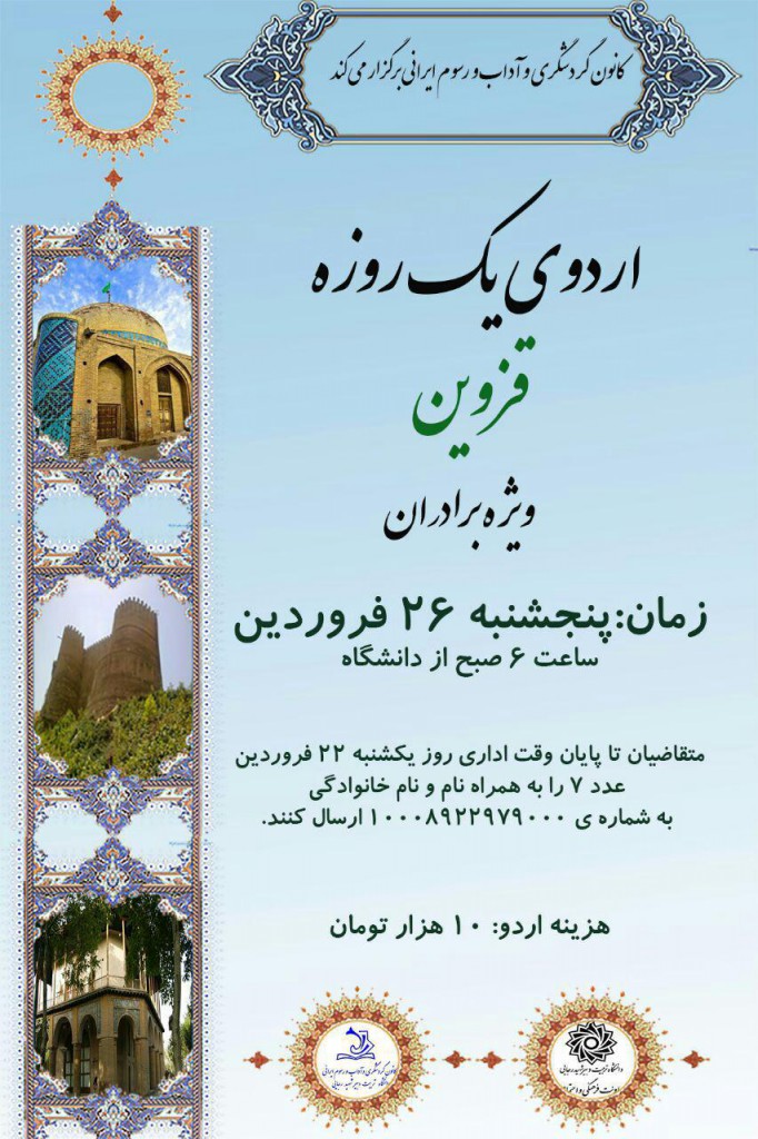 کانون گردشگری و آداب و رسوم ایرانی اردوی یک روزه قزوین مورخ پنجشنبه ۲۶ فروردین ۱۳۹۵ را  برگزار نمود.