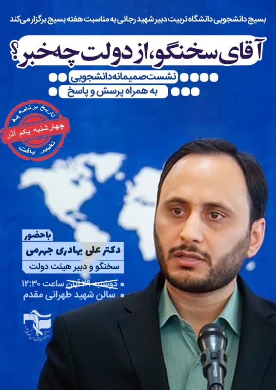 آقای سخنگو، از دولت چه خبر؟ ۱ آذر ۱۴۰۲/در اخبار معاونت فرهنگی و اجتماعی /توسط culture بسیج دانشجویی دانشگاه تربیت دبیر شهیدرجایی برگزار میکند : ویژه برنامه : << آقای سخنگو،از دولت چه خبر؟ >> نشست صمیمانه دانشجویی پرسش و پاسخ با حضور : دکتر بهادری جهرمی (سخنگوی و دبیر هیئت دولت) زمان : چهارشنبه ۱ آذر ، ساعت ۱۲:۳۰ مکان : سالن شهید طهرانی مقدم مکتب رجایی، رسانه تخصصی تعلیموتربیت @maktab_rajaee https://www.sru.ac.ir/wp-content/uploads/2023/11/14-1.jpg 800 566 culture https://www.sru.ac.ir/wp-content/uploads/2020/06/arm-uni-97-white-300x300.png culture2023-11-22 09:12:062023-11-22 10:01:30آقای سخنگو، از دولت چه خبر؟