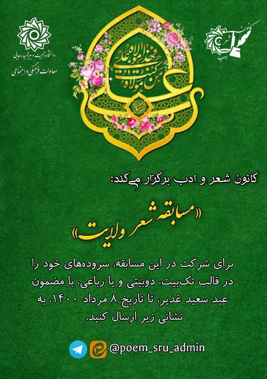 برای شرکت در این مسابقه، سرودههای خود را در قالب تکبیت، دوبیتی و یا رباعی، با مضمون واقعهی غدیر خم، تا تاریخ ۸ مرداد ۱۴۰۰، به نشانی زیر در تلگرام یا ایتا ارسال کنید: