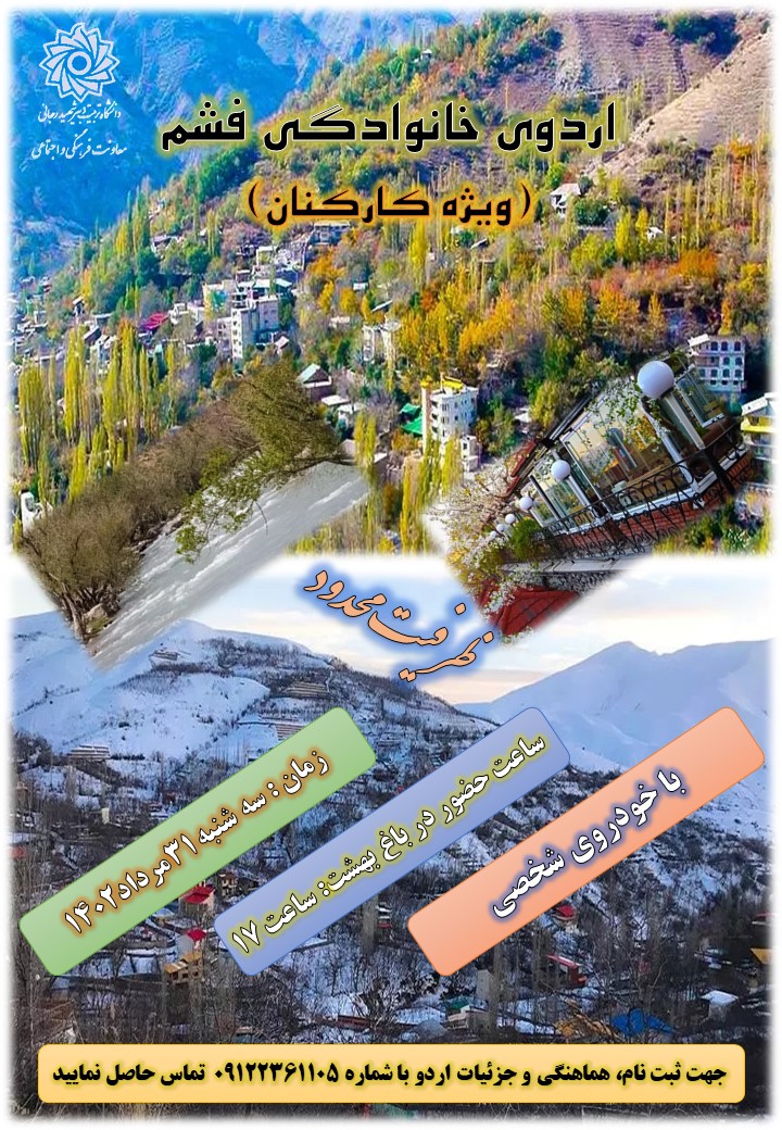اردوی خانوادگی ویژه کارکنان فشم ۲۷ مرداد ۱۴۰۲/در اخبار معاونت فرهنگی و اجتماعی /توسط cultureمعاونت فرهنگی و اجتماعی دانشگاه برگزار می کند؛ اردوی خانوادگی ویژه کارکنان فشم با خودرو شخصی ظرفیت محدود زمان ؛ سه شنبه ۳۱ مرداد ۱۴۰۲ مهلت ثبت نام : ساعت ۱۴ روز یکشنبه ۲۹ مرداد ساعت حضور در باغ بهشت: ساعت ۱۷ جهت ثبت نام، هماهنگی وجزئیات اردو با شماره ۰۹۱۲۲۳۶۱۱۰۵ تماس حاصل نمایید. https://www.sru.ac.ir/wp-content/uploads/2023/08/اردوی-فشم-ویژه-کارکنان.jpg 1040 720 culture https://www.sru.ac.ir/wp-content/uploads/2020/06/arm-uni-97-white-300x300.png culture2023-08-18 14:43:292023-08-18 14:43:29اردوی خانوادگی ویژه کارکنان فشم