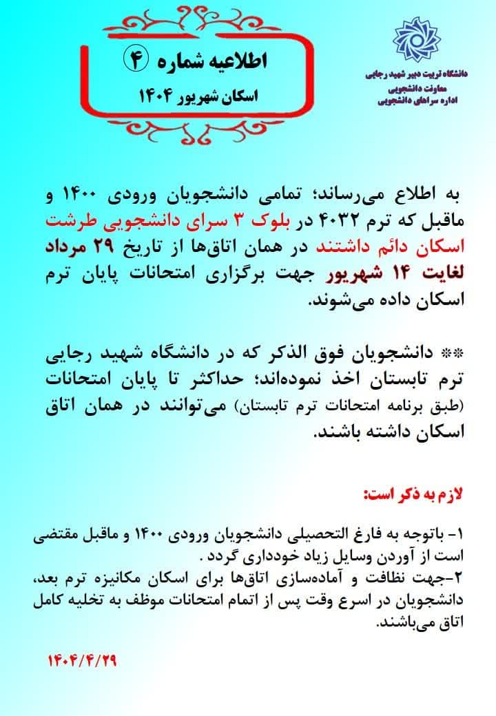 اطلاعیه شماره ۴، اسکان شهریور ۱۴۰۴ ۲۹ تیر ۱۴۰۴/در اخبار معاونت دانشجویی /توسط student https://www.sru.ac.ir/wp-content/uploads/2023/01/11اطلاهيه-اداره-خوابگاه-ها.jpg 250 354 student https://www.sru.ac.ir/wp-content/uploads/2020/06/arm-uni-97-white-300x300.png student2025-07-20 08:07:372025-07-20 08:07:37اطلاعیه شماره ۴، اسکان شهریور ۱۴۰۴