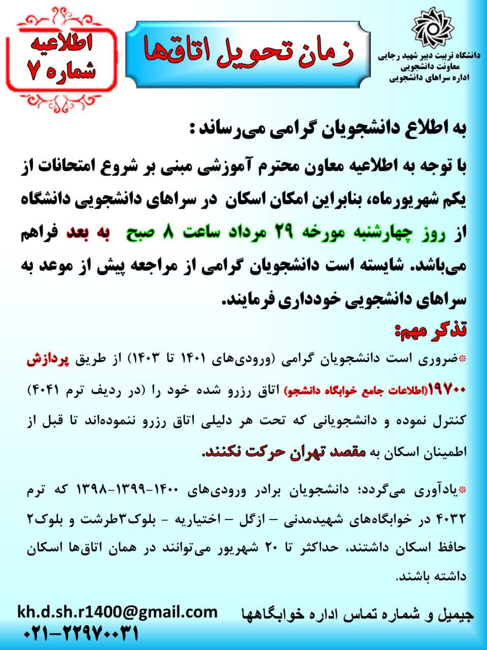 اطلاعیه شماره ۷، زمان تحویل اتاق ها ۱۹ مرداد ۱۴۰۴/در Uncategorised, اخبار معاونت دانشجویی /توسط student https://www.sru.ac.ir/wp-content/uploads/2023/01/11اطلاهيه-اداره-خوابگاه-ها.jpg 250 354 student https://www.sru.ac.ir/wp-content/uploads/2020/06/arm-uni-97-white-300x300.png student2025-08-10 10:48:542025-08-10 10:49:52اطلاعیه شماره ۷، زمان تحویل اتاق ها