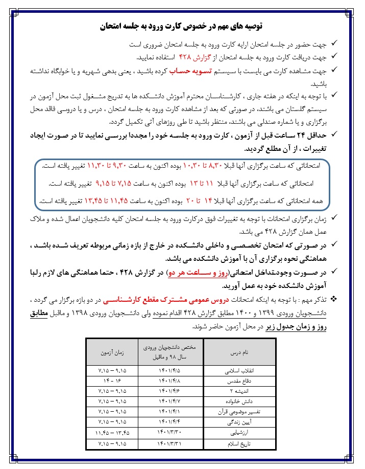 روز و ساعت مندرج در گزارش ۴۲۸ ملاك عمل در آزمون هاي پايان ترم كليه دانشجويان مي باشد. اطلاع رساني در خصوص تغييرات احتمالي در مورد آزمون هاي داخلي دانشكده ها ،بدون اعمال در سامانه گلستان، بر عهده آموزش دانشكده مي باشد.