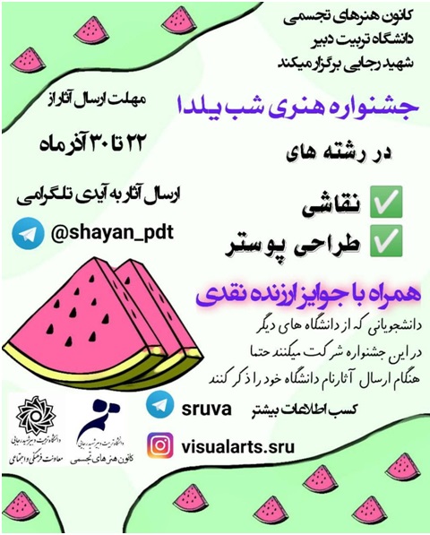 به گزارش اداره فرهنگی و فوق برنامه ؛ کانون هنرهای تجسمی دانشگاه تربیت دبیر شهید رجایی به مناسبت شب یلدا جشنواره ای مجازی در دو بخش: