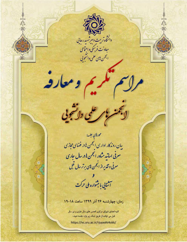 مراسم تکریم و معارفه انجمن های علمی با حضور معاونت محترم فرهنگی و اجتماعی دانشگاه، مسئولین حوزه فرهنگی دانشگاه و جمعی از دانشجویان در سامانه بر خط دانشگاه چهارشنبه ۲۶ آذر برگزار شد.