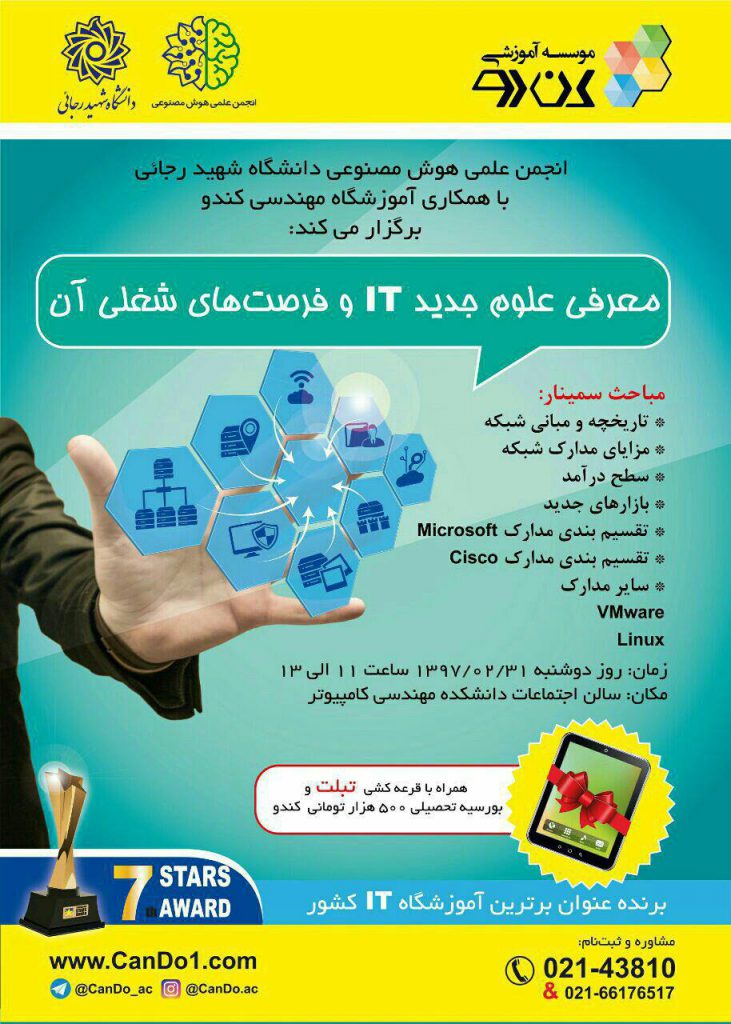 این سمینار در روز دوشنبه ۳۱ اردیبهشت ماه از ساعت۱۱ الی ۱۳ در سالن اجتماعات دانشکده مهندسی کامپیوتر توسط انجمن هوش مصنوعی دانشکده با همکاری آموزشگاه مهندسی کندو برگزار گردید.