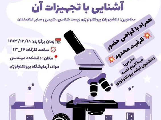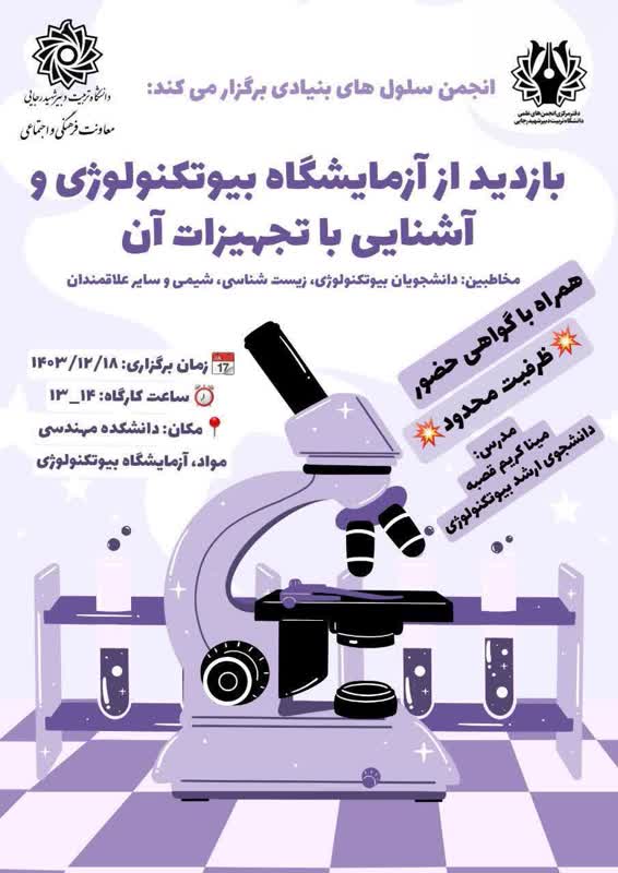 به گزارش روابط عمومی معاونت فرهنگی و اجتماعی، انجمن علمی دانشجویی سلول های بنیادی دانشگاه تربیت دبیر شهید رجایی، کارگاه “بازدید از آزمایشگاه بیوتکنولوژی و آشنایی با تجهیزات آن” را برگزار می کند: