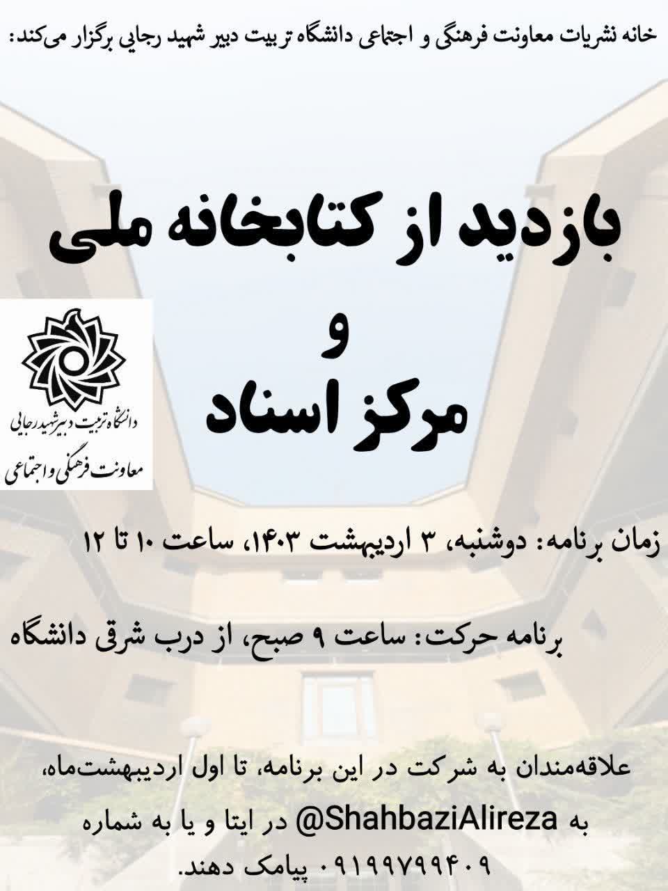 علاقه مندان جهت ثبت نام دربازدید به شماره۰۹۱۹۹۷۹۹۴۰۹ ویا به آیدیShahbaziAlireza@ در ایتا پیام دهند .