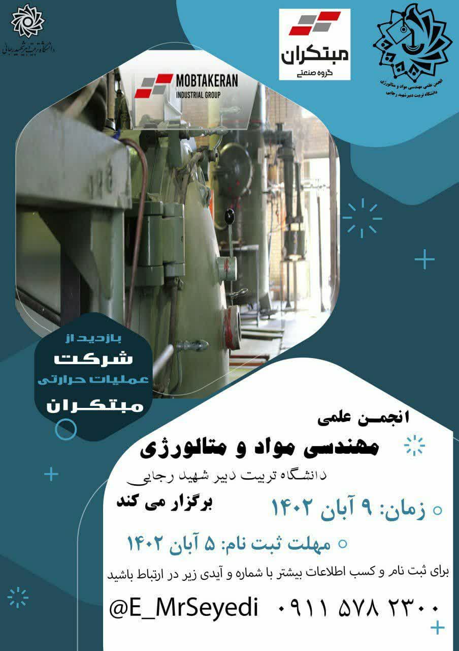 معاونت فرهنگی و اجتماعی خبر داد : به همت انجمن علمی دانشجویی مهندسی موادومتالوژی دانشگاه تربيت دبیر شهید رجایی بر گزار می گردد: بازدید دانشجویان مواد و متالوژی از شرکت عملیات حرارتی و شرکت های وابسته واقع در مجتمع صنعتی شمس آباد زمان : ۹ آبان ۱۴۰۲