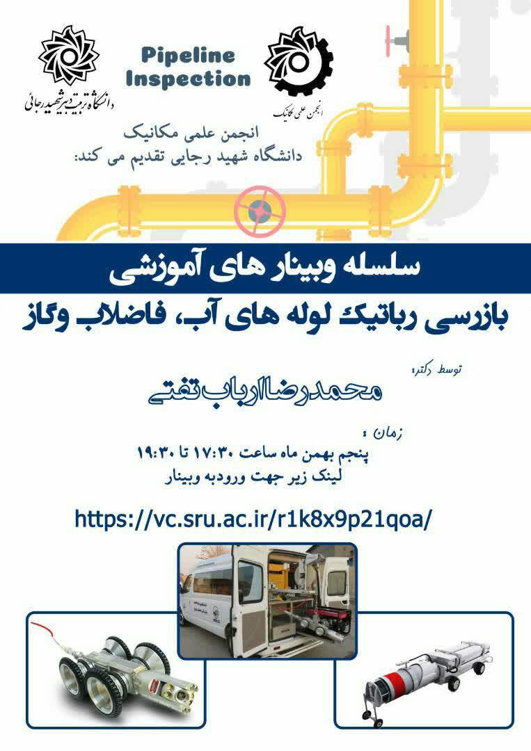 دبیر انجمن علمی مکانیک دانشگاه خبر داد؛ با همت این انجمن، سلسله وبینارهای آموزشی “بازرسی رباتیک لوله های آب، فاضلاب و گاز ” در تاریخ پنجم بهمن ماه ۱۴۰۰، توسط آقای دکتر محمد رضا ارباب تفتی، برگزار گردید.