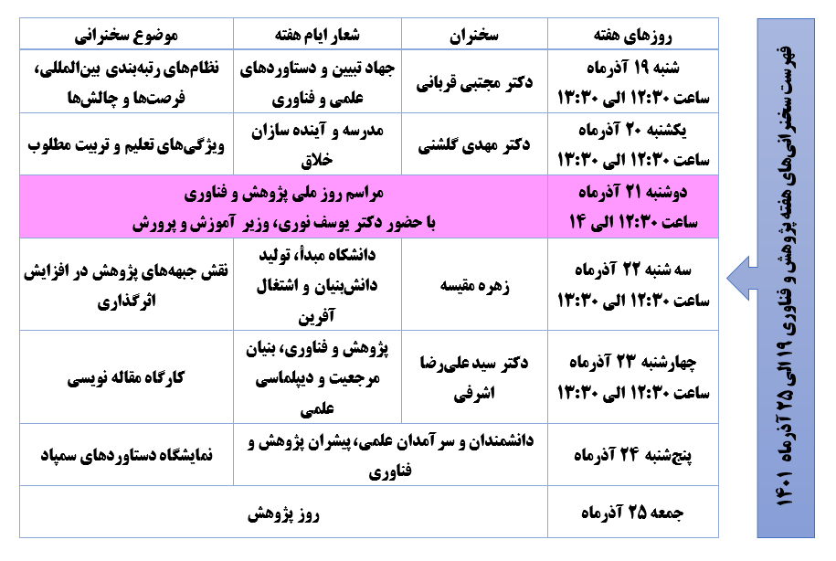 معاونت پژوهش و فناوری دانشگاه در نظر دارد، مجموعه سخنرانی‌های علمی را جهت ارتقاء سطح کیفی و کمّی تولیدات پژوهشی از تاریخ ۱۴۰۱/۰۹/۱۹لغایت ۱۴۰۱/۰۹/۲۳به صورت مجازی و با اعطای گواهی دانش‌افزایی برگزار نماید.