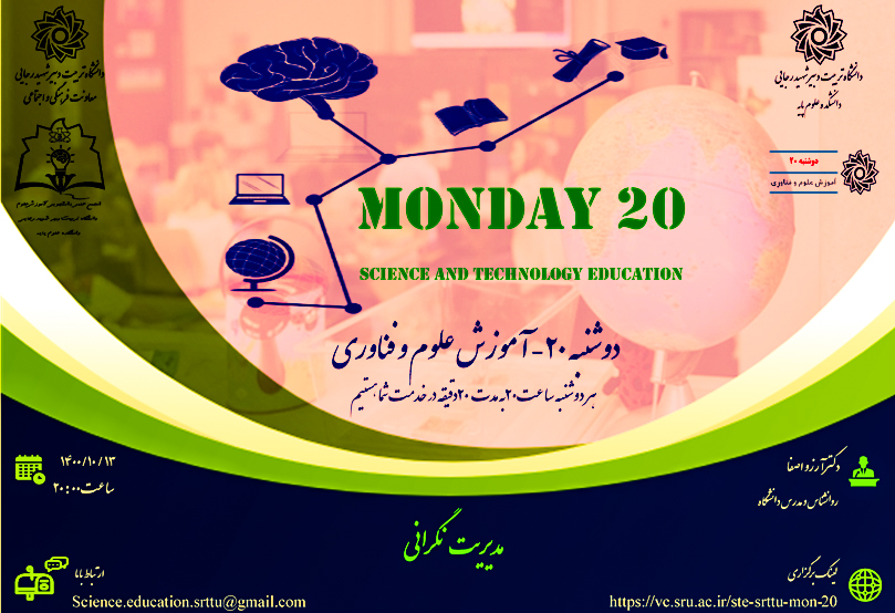 لازم به ذکر است برنامه دوشنبه ۲۰- آموزش علوم و فناوری، فضایی به منظور توجه به آموزش مفاهیم در علوم و فناوری به زبان ساده و اطلاع رسانی تجارب یادگیری و دستاوردهای نوین در زمینه آموزش علوم و فناوری بوده و مسئولیت ارائه مطالب با خود ارائه کنندگان محترم می باشد.