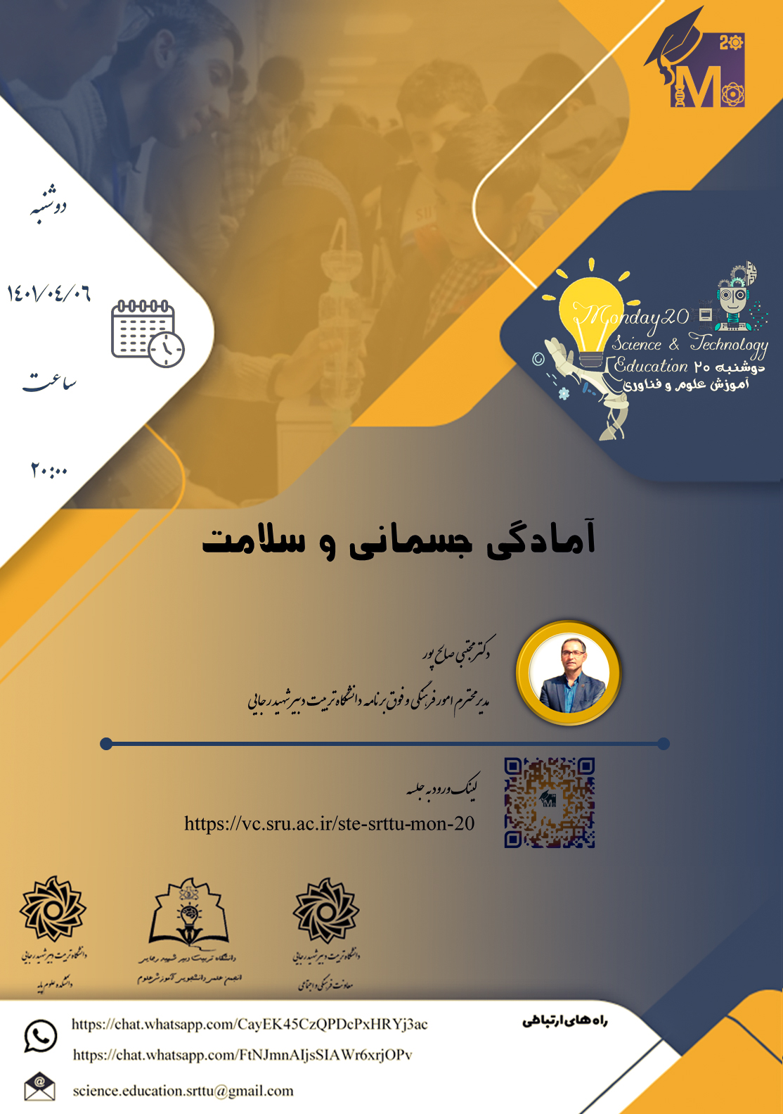 ادرس پست الکترونیکی به نشانی  science.education.srttu@gmail.com برای هرگونه مکاتبه لازم در این راستا معرفی می شود. همچنین علاقمندان به منظور اطلاع از برنامه دوشنبه ۲۰، می توانند از کانال این برنامه به نشانی زیر استفاده نمایند (اطلاع رسانی در هر دو کانال به صورت یکسان انجام می شود).