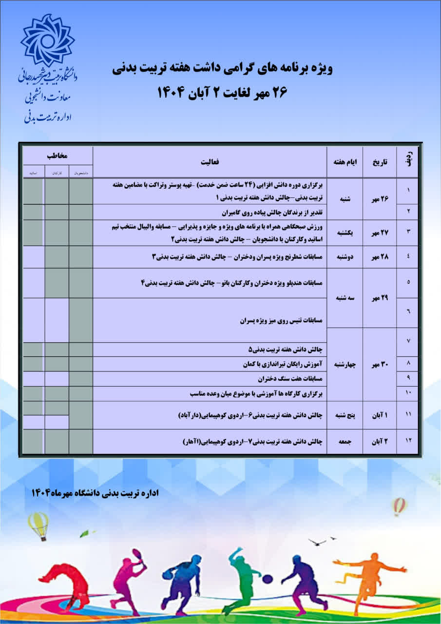 برنامه های گرامی داشت هفته تربیت بدنی ۲۶ مهر لغایت ۲ آبان ماه