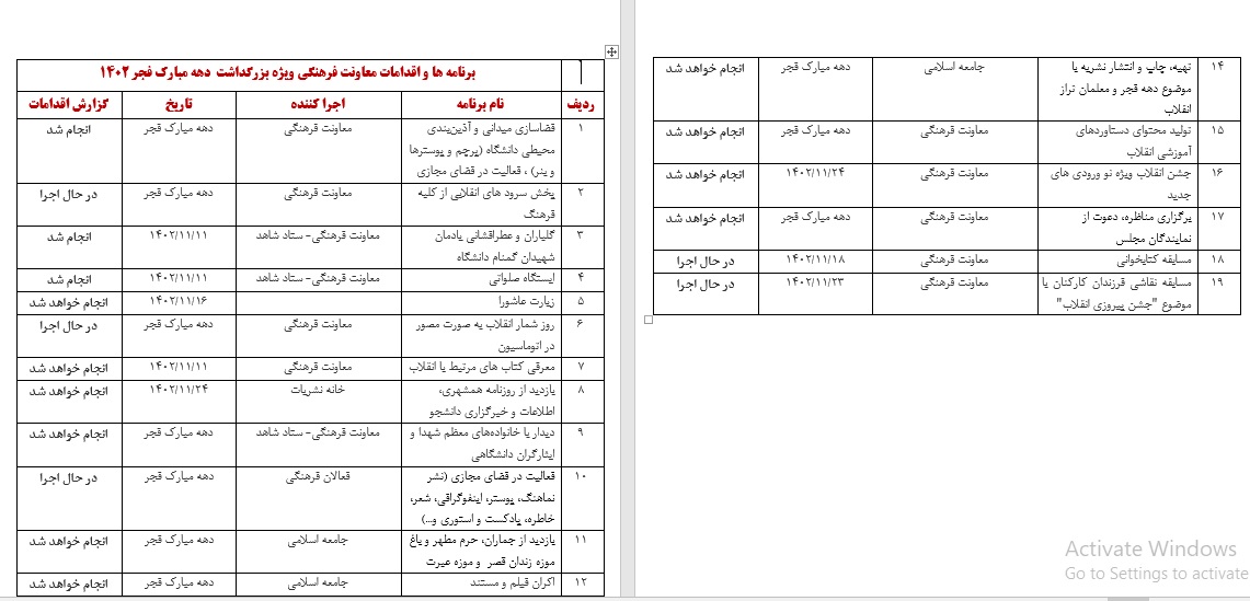 لیست اقدامات معاونت فرهنگی و اجتماعی و دانشکده های دانشگاه تربیت دبیر شهید رجایی در دهه ی مبارک فجر و به مناسبت چهل و پنجمین سالگرد انقلاب شکوهمند اسلامی به شرح جدول زیر است: