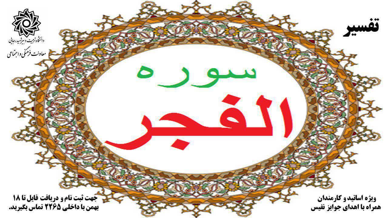 به گزارش کارشناس مسئول فرهنگی دانشگاه به مناسبت ایام دهه مبارک فجر انقلاب اسلامی مسابقه تفسیر سوره فجر در بین همکاران دانشگاه در روز یکشنبه ۱۴۰۰/۱۱/۲۴ برگزار شد که بعد از دریافت و بررسی پاسخنامه ها ۴ نفر از همکاران که بالاترین امتیاز را کسب نموده اند به عنوان برنده به شرح ذیل اعلام می گردد. ضمنا هدایای نقدی برندگان توسط معاونت فرهنگی و اجتماعی دانشگاه به حساب آنان واریز خواهد شد.