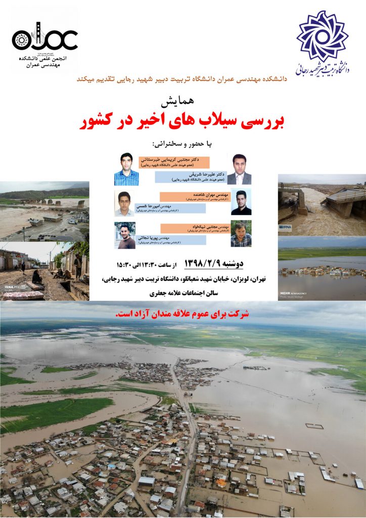 در راستاي بررسي عوامل مختلف اثر گذار بر سيلابهاي مخربي كه در فروردين سال ۱۳۹۸ در كشور به وقوع پيوستند، گروه آموزشي مهندسي ژئوتكنيك و آب و انجمن علمي دانشكده مهندسي عمران همايش تخصصي “بررسي سيلاب هاي اخير در كشور” را با حضور اساتيد دانشكده و متخصصان مربوطه در روز دوشنبه ۹ اردبيهشت ۱۳۹۸ از ساعت ۱۳:۳۰ الي ۱۵:۳۰ در سالن احتماعات علامه جعفري برگزار مي نمايد.