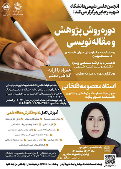 دوره با عنوان“روش پژوهش و مقاله نویسی” توسط خانم دکتر معصومه قلخانی دانشیار دانشکده علوم پایه دانشگاه تربیت دبیر شهید رجایی،با همکاری انجمن علمی شیمی مورخ پنجشنبه ۱۹ مهرماه۱۴۰۳ ساعت ۱۳ برگزار گردید.