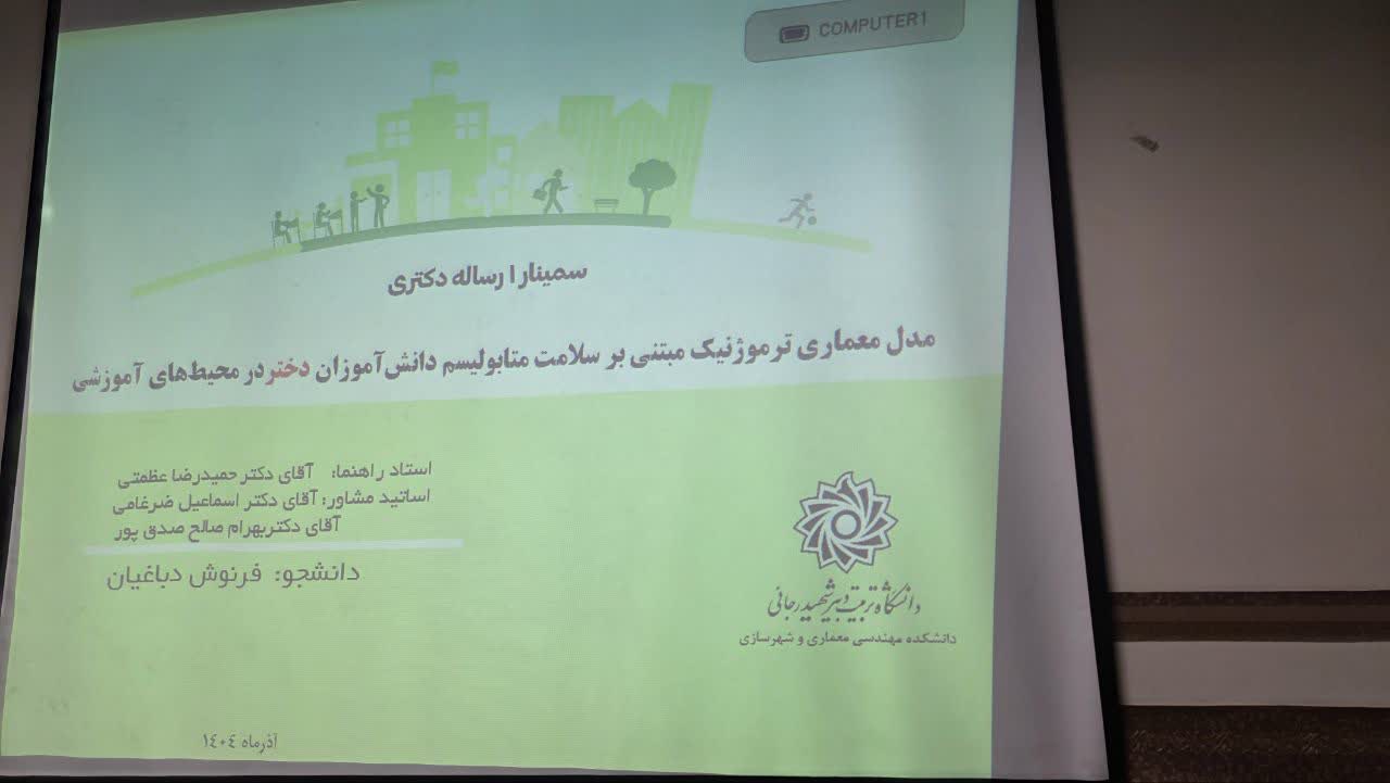 جلسه سمینار یک دانشجو مهندس فرنوش دباغیان در روز شنبه مورخ ۱۵ آذر ماه ۱۴۰۴ در اتاق جلسات دانشکده مهندسی معماری برگزار شد. استاد راهنما آقای دکتر حمیدرضا عظمتی و مشاور آقای دکتر ضرغامی در این جلسه حضور داشتند. همچنین داوران داخلی این جلسه خانم دکتر مرضیه آزاد ارمکی و جناب آقای دکتر علی شرقی بودند. این جلسه با حضور مهمانان محترم آقای دکتر قنبران و خانم دکتر فاطمه جم به عنوان نماینده تحصیلات تکمیلی برگزار شد.