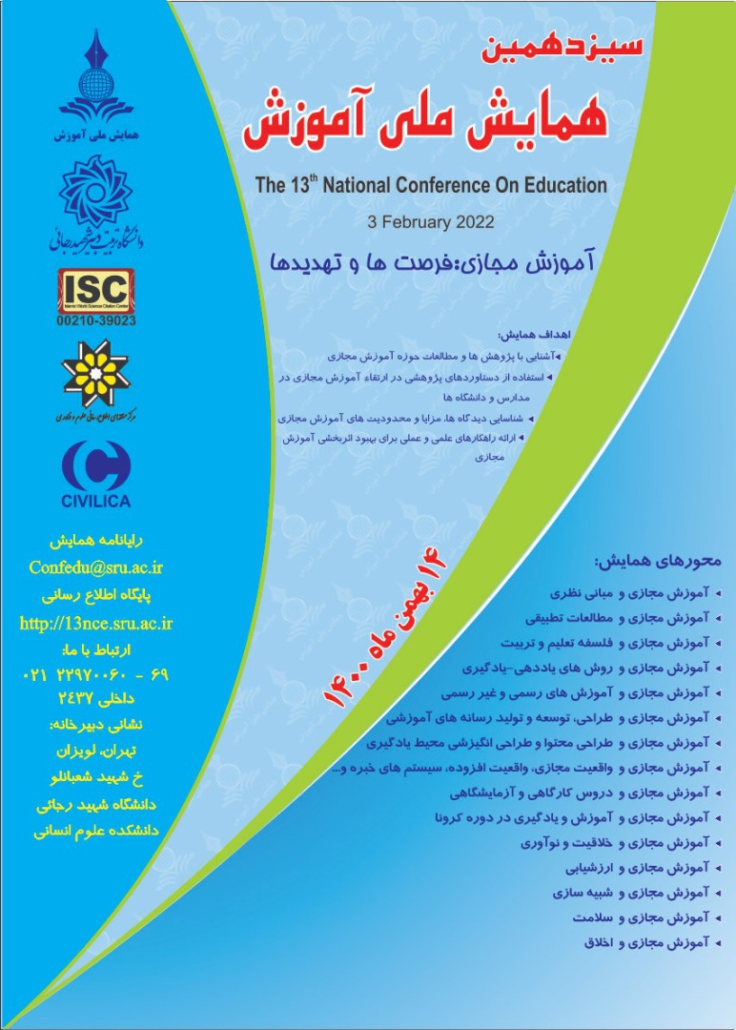 سیزدهمین همایش ملی آموزش با محوریت آموزش مجازی، در ۱۴ بهمن ماه ۱۴۰۰ در دانشگاه تربیت دبیر شهید رجایی به صورت مجازی برگزار می گردد. قابل ذکر است که نتایج اولیه مقالات بر روی صفحه اول سایت همایش قابل دسترسی می باشد. ضمنا فرصت ارسال مقالات تا ۲۹ دی ماه ۱۴۰۰ تمدید گردیده است.