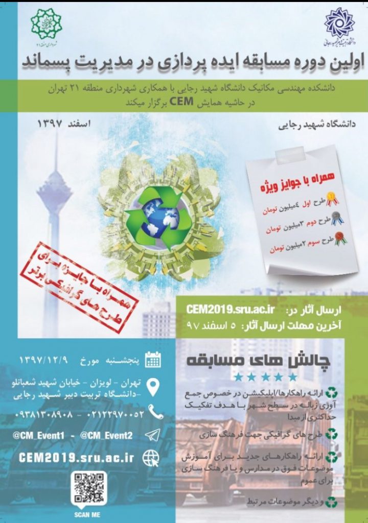 امروزه با تغییر سبک زندگی، مدیریت پسماند به یک امر مهم و ضروری در شهرها و روستاها تبدیل شده است. دانشگاه شهید رجائی به عنوان یک مسئولیت اجتماعی وظیفه خود دانسته تا یکی از زمینه ­های فعالیت خود را در این مهم تعریف نماید. از این رو بیش از یک سال است که تیمی در این دانشگاه متشکل از برخی اساتید و دانشجویان به امر فرهنگ سازی و آموزش مدیریت پسماند از طریق برگزاری کلاس های جذاب و مفرح در برخی دبستان­ های تهران پرداخته است. یکی دیگر از فعالیت های این گروه، ارائه راهکار به شهرداری جهت جمع ­آوری و تفکیک پسماند است. همچنین این گروه توسعه فناوری­ های مرتبط با این حوزه را مدنظر قرارداده و طرح هایی را نیز اجرا نموده یا در برنامه آتی خود دارد. در این راستا، این گروه همگام با فرهنگ سازی جهانی برای مدیریت پسماند که شعار آن ۳Rs، مخفف سه کلمه Reduce، Reuse، و Recycle است، به بومی سازی شعار “۳-باز”، مخفف سه کلمه “بازنگری مصرف،” “بازمصرف” و “بازیافت” به منظور “کاهش پسماند و حفظ محیط زیست،” رسیده است. حال این گروه مشتاق به همکاری در مباحث فوق با افراد علاقه مند است. از این جهت در اولین گام برای شناخت این پتانسیل ­ها، در حاشیه اولین همایش ملی “مکانیک محاسباتی و  تجربی” مسابقه ای ترتیب داده و از ایده­ های ارائه شده در حوزه مدیریت شهری استقبال می­ نماید.