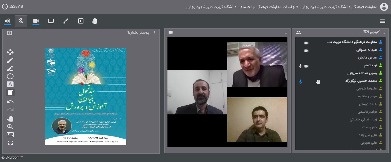 در روز چهارشنبه ۹۹/۱۱/۱۵ توسط آقای دکتر مهدی نویدادهم دبیرکل سابق شورای عالی آموزش و پرورش و از مسئولان اصلی تدوین سند تحول بنیادین با شرکت تعداد قابل توجهی از اعضای هیأت علمی دانشگاه برگزار گردید. در این جلسه که به صورت تعاملی برگزار شد حاضران نیز دیدگاه ها، پیشنهادها و انتقادهای خود را مطرح کردند که مورد بحث و تبادل نظر قرار گرفت. مقرر گردید کلیه نظرات و پرسش های مطرح شده توسط شرکت کنندگان برای بررسی و پاسخ دادن، برای سخنران جلسه ارسال گردد و پاسخ های داده شده به اطلاع حاضران جلسه رسانده شود.