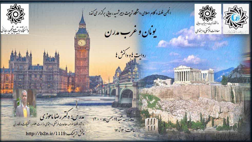 معاونت فرهنگی و اجتماعی خبر داد؛ برگزاری وبینار، یونان و غرب مدرن، به همت انجمن فلسفه و کلام اسلامی سه شنبه ۱۴۰۰/۱۱/۱۹ ساعت ۱۴_۱۳ از همه دانشجویان، بویژه دانشجویان دانشکده علوم انسانی دعوت به شرکت در این وبینار می گردد.