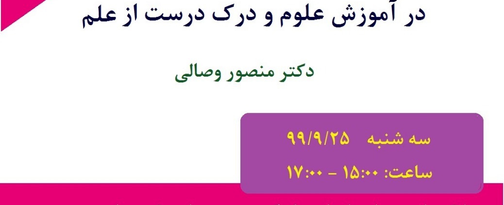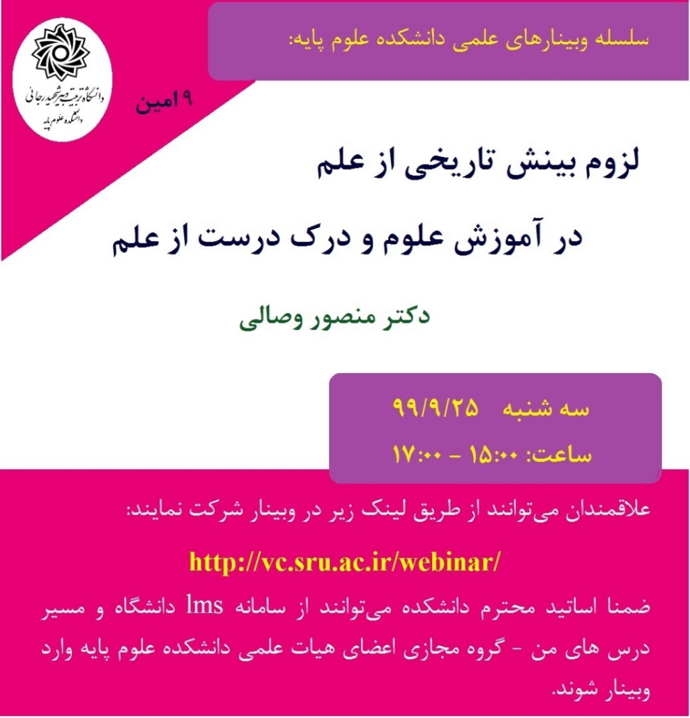 در ادامه برگزاری وبینارهای علمی دانشکده علوم پایه، سخنرانی آقای دکتر منصور وصالی عضو محترم هیات علمی گروه فیزیک دانشکده علوم پایه در روز سه شنبه ۲۵ آذر ماه از ساعت ۱۵ الی ۱۷ با عنوان “لزوم بینش تاریخی از علم در آموزش علوم و درک درست از علم” به صورت مجازی برگزار می شود.