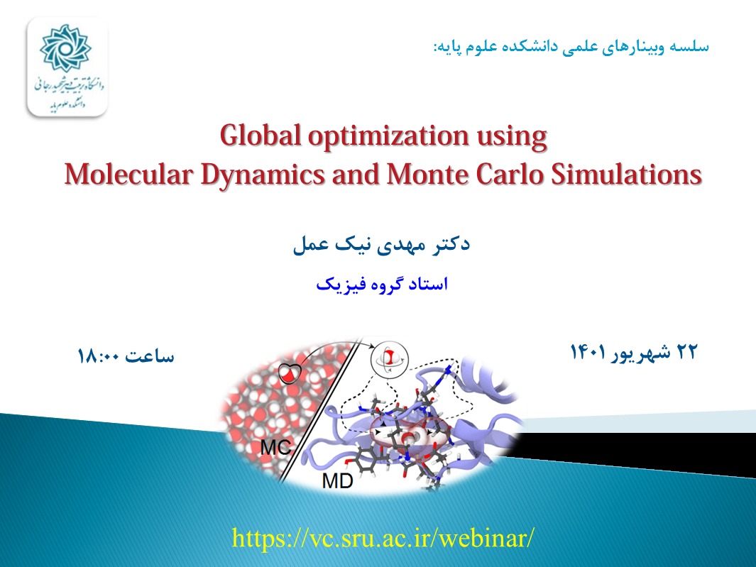 “Global optimization using Molecular Dynamics and Monte Carlo Simulations ” توسط جناب آقای دکتر مهدی نیک عمل استاد گروه فیزیک دانشکده علوم پایه در تاریخ سه شنبه ۲۲ شهریور ماه ساعت ۱۸ به صورت مجازی برگزار می شود.