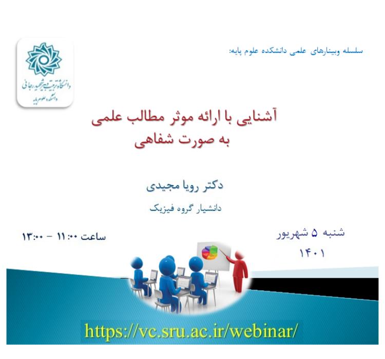 در ادامه برگزاری وبینارهای علمی دانشکده علوم پایه، وبیناری با عنوان “آشنایی با ارائه موثر مطالب علمی به صورت شفاهی” توسط سرکار خانم دکتر رویا مجیدی عضو عضو محترم هیئت علمی گروه فیزیک دانشکده علوم پایه در تاریخ شنبه ۵ شهریور ماه از ساعت ۱۱ الی ۱۳ به صورت مجازی برگزار می شود.