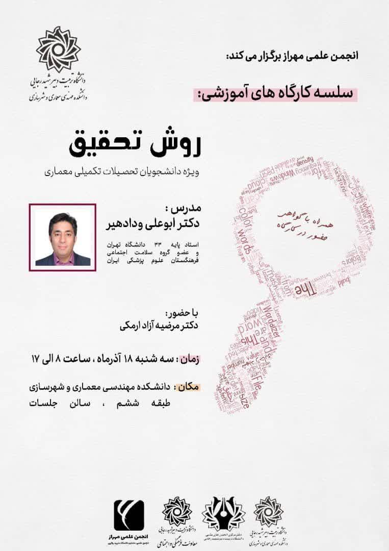کارگاه آموزشی روش تحقیق جهت دانشجویان تحصیلات تکمیلی در دانشکده مهندسی معماری و شهرسازی مورخ ۱۸ آذر ماه با هدایت آقای دکتر ابوعلی ودادهیر استاد تمام دانشگاه تهران و خانم دکتر آزاد ارمکی انجام شد. این کارگاه از ساعت ۹ صبح الی ۶ عصر روز سه شنبه در سالن جلسات دانشکده صورت گرفت. دانشجویان به بررسی پارادایم های کیفی، کمی و ترکیبی در عرصه معماری پرداختند.