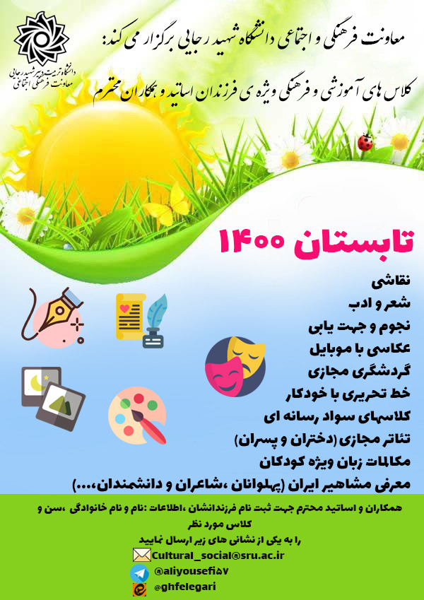 📝جهت ثبت نام، نام و نام خانوادگی،سن و کلاس یا کلاس های انتخابی را به ایمیل معاونت فرهنگی cultural_social@sru.ac.ir یا آیدی تلگرامی aliyousefi57@ و ایتای ghfelegari@ ارسال فرمایید.