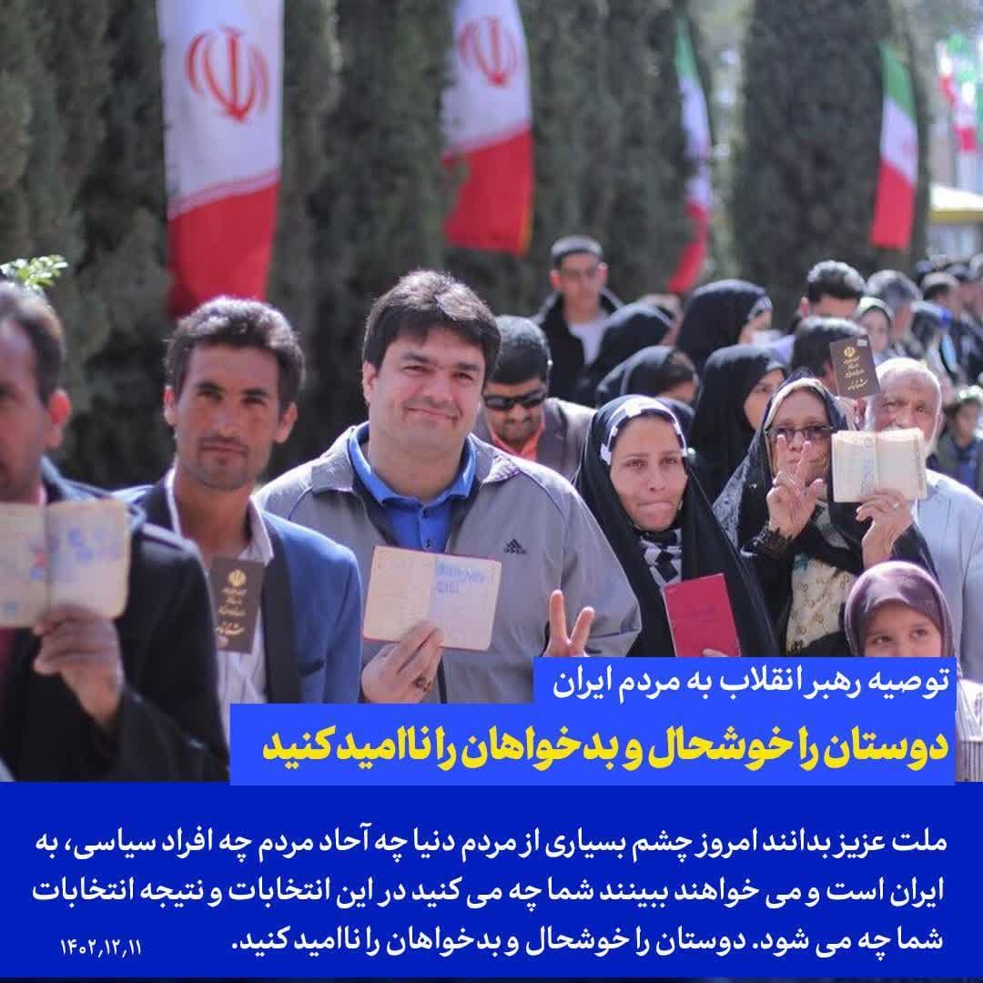 ملّت عزیزمان بدانند که امروز چشم بسیاری از مردم دنیا، چه آحاد مردم و چه افراد سیاسی و صاحبان جایگاه‌های معتبر ملّی و سیاسی به ایران است، چشمشان به شما است؛ میخواهند ببینند که شما چه میکنید در این انتخابات، و نتیجه‌ی انتخابات شما چه میشود؛ هم دوستان ما و افرادی که علاقه‌مند به ملّت ایرانند، هم  بدخواهان؛ آنها هم همین‌جور. از همه طرف چشمها مترصّد کشور ما است و مترصّد مسائل ملّت عزیز ما است. به این توجّه کنید. دوستان را خوشحال کنید و بدخواهان را ناامید کنید.