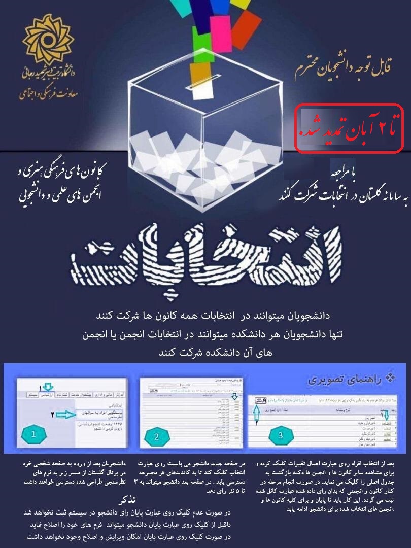 به گزارش رییس اداره فرهنگی و فوق برنامه انتخابات شورای مرکزی انجمن های علمی-دانشجویی و کانون های فرهنگی-هنری دانشجویان تا ۲ آبان ماه تمدید شد.