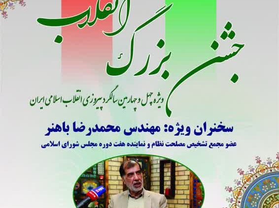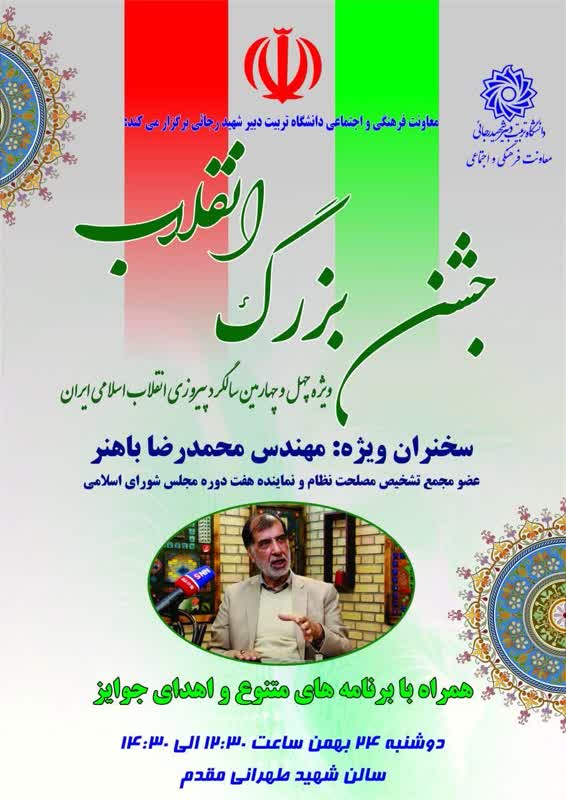 جشن بزرگ انقلاب ویژه چهل و چهارمین سالگرد پیروزی انقلاب اسلامی ایران سخنران ویژه: مهندس محمد رضا باهنر عضو مجمع تشخیص مصلحت نظام و نماینده هفت دوره مجلس شورای اسلامی همراه با برنامه های متنوع و اهدای جوایز دوشنبه ۲۴ بهمن ساعت ۱۲:۳۰ الی ۳۰ :۱۴ سالن شهید طهرانی مقدم.