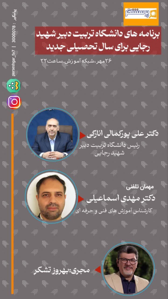 به گزارش روابط عمومی دانشگاه، دکتر علی پورکمالی انارکی رئیس دانشگاه تربیت دبیر شهید رجائی روز شنبه ۲۶ مهرماه ۱۴۰۴ ساعت ۲۲ تا ۲۳ مهمان حضوری برنامه پرسشگر شبکه آموزش سیما بود. برنامه «پرسشگر» با هدف بررسی چالش های آموزش کشور و عدالت آموزشی، شنبه ساعت ۲۲ روی آنتن شبکه آموزش سیما می رود. بهروز تشکر مجری این برنامه است و دکتر مهدی اسماعیلی، کارشناس آموزش های فنی و حرفه ای مهمان تلفنی برنامه این هفته بود.