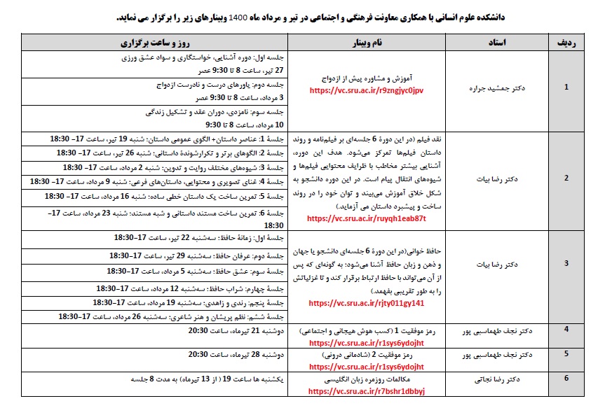 https://www.sru.ac.ir/wp-content/uploads/2020/06/arm-uni-97-white-300x300.png00culturehttps://www.sru.ac.ir/wp-content/uploads/2020/06/arm-uni-97-white-300x300.pngculture2021-07-13 10:49:212021-07-13 10:49:21دانشکده علوم انسانی با همکاری معاونت فرهنگی و اجتماعی در تیر و مرداد ماه ۱۴۰۰ وبینارهای زیر را برگزار می نماید.