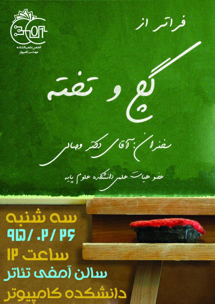 دانشکده مهندسی کامپیوتر برگزار میکند ۲۴ اردیبهشت ۱۳۹۶/در اخبار دانشکده کامپیوتر /توسط دانشکده مهندسی کامپیوتربدین وسیله به اطلاع دانشجویان محترم میرساند سخنرانی آقای دکتر وصالی عضو هیئت علمی دانشکدهی علوم پایه با عنوان گچ و تخته در روز سه شنبه مورخ ۹۵/۲/۲۶ ساعت ۱۲ در سالن آمفی تئاتر دانشکدهی مهندسی کامپیوتر برگزار میشود. https://www.sru.ac.ir/wp-content/uploads/2017/05/photo_2017-05-14_18-50-44.jpg 1280 905 دانشکده مهندسی کامپیوتر https://www.sru.ac.ir/wp-content/uploads/2020/06/arm-uni-97-white-300x300.png دانشکده مهندسی کامپیوتر2017-05-14 18:52:142017-05-14 18:52:14دانشکده مهندسی کامپیوتر برگزار میکند