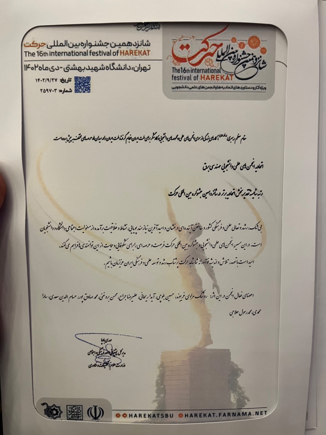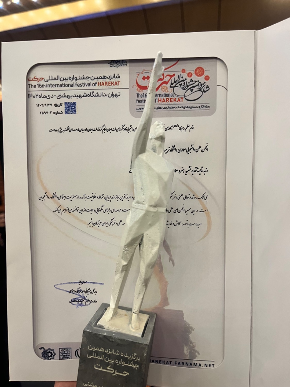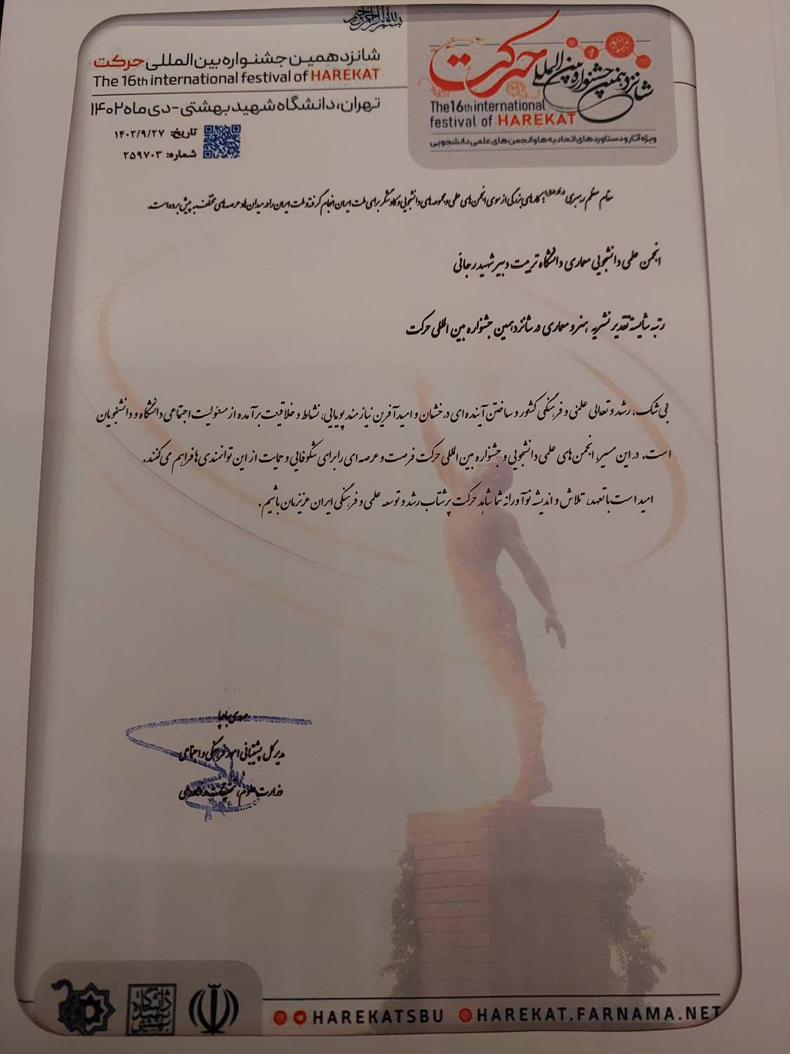 درخشش انجمن علمی دانشجویی معماری “مهراز” و اتحادیه مهندسی برق و مهندسی پزشکی و مهندسی انرژی و راه آهن در شانزدهمین جشنواره ی بین المللی حرکت