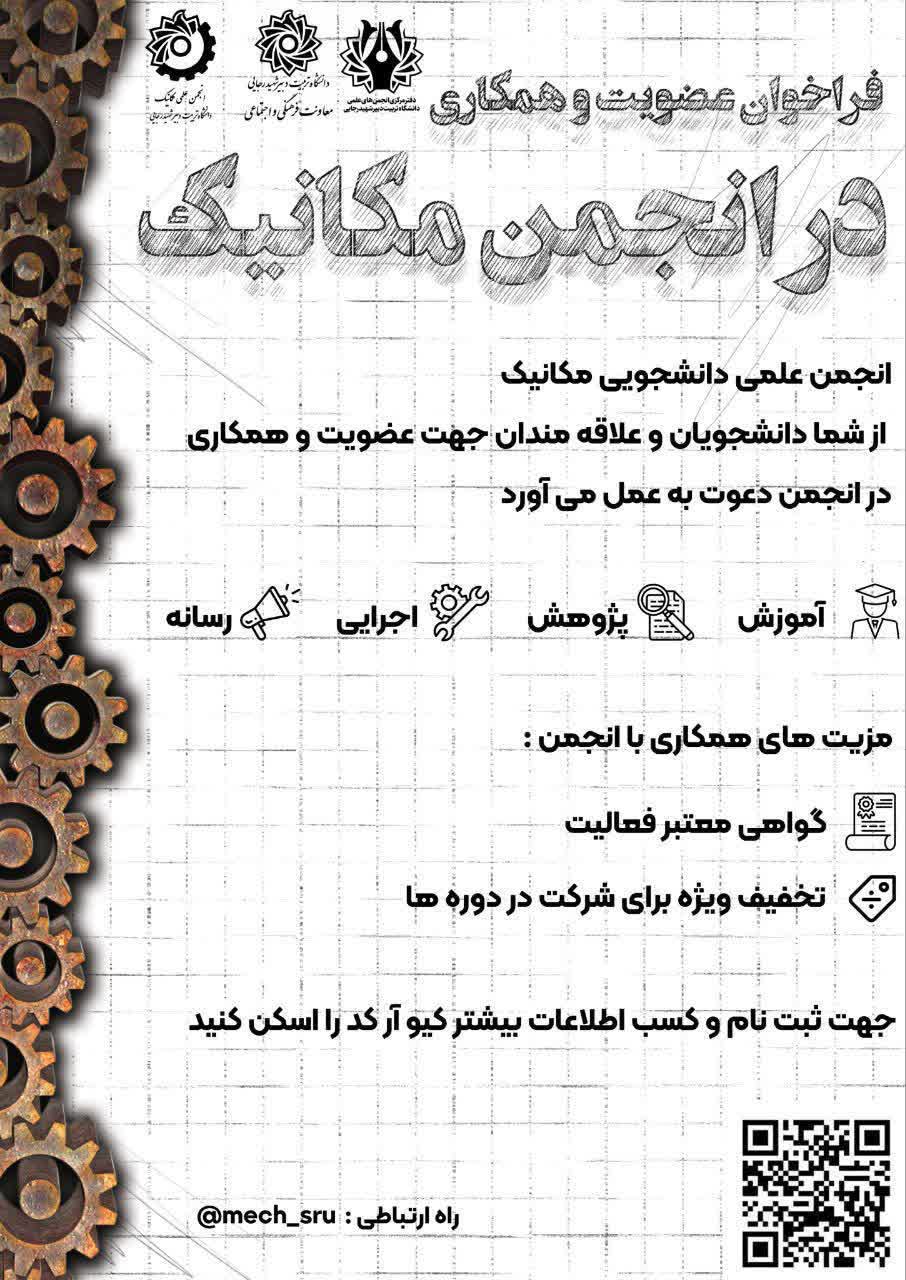 انجمن علمی دانشجویی مکانیک دانشگاه تربیت دبیر شهید رجایی در راستای تحقق اهداف دانشکده و رشد دانشجو از شما دانشجویان و علاقمندان جهت عضویت و همکاری در انجمن در زمینه های زیر دعوت به عمل می آورد :