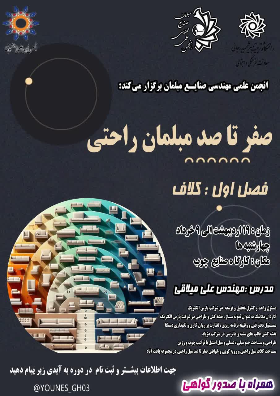 به همت انجمن علمی دانشجویی مهندسی صنایع مبلمان دانشگاه تربيت دبیر شهید رجایی برگزار می گردد :