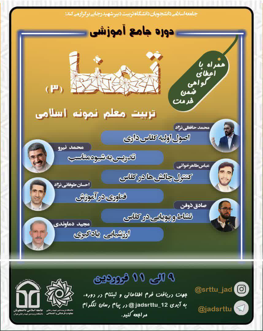معاونت فرهنگی و اجتماعی خبر داد؛ به گزارش کارشناس مسئول معاونت فرهنگی دانشگاه به همت جامعه اسلامی دانشجویان دانشگاه تربیت دبیر شهید رجایی دوره جامع آموزشی “تمنا۳” در ۶ نشست با حضور اساتید مجرب و برجسته از ۹ الی ۱۲ فروردین ۱۴۰۱برگزار گردید. در این دوره که به صورت مجازی و در بستر lms برگزار کردید، ۳۵۰ نفر از دانشجو معلمان دانشگاه تربیت دبیر شهید رجایی و دانشگاه های فرهنگیان سراسر کشور ثبت نام کرده و در جلسات به طور متغیر ۱۳۰ تا ۱۵۰ نفر به صورت مداوم شرکت داشتند.