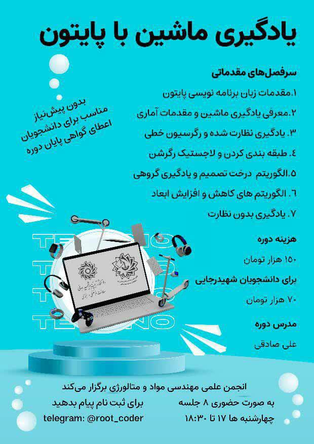 🔵 معاونت فرهنگی و اجتماعی دانشگاه خبر داد؛ به همت انجمن علمی مهندسی مواد و متالورژی دانشگاه تربیت دبیر شهید رجایی برگزار می گردد: 📣 دوره های آموزشی: یادگیری ماشین با پایتون در ۸ جلسه حضوری ⏰ زمان: چهارشنبه ها، ساعت ۱۸/۳۰_۱۷ به صورت حضوری 🌹 مکان: دانشکده مهندسی مواد و متالوژی