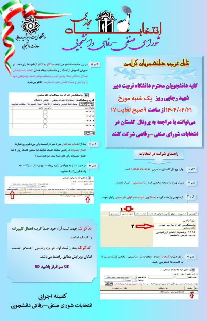 برای شرکت در انتخابات باید در سامانه گلستان رای دهید. برای اطلاع از چگونگی آن، گامهای پوستر را دنبال کنید.