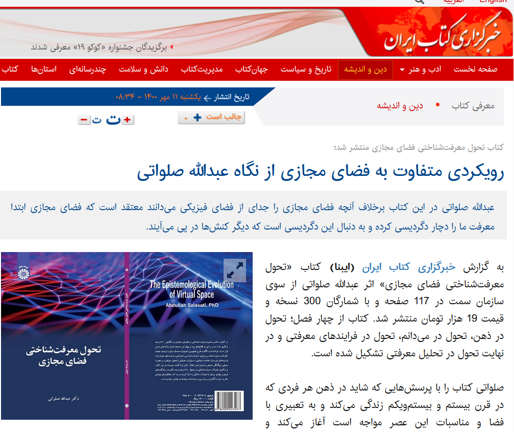 به گزارش خبرگزاری کتاب ایران (ایبنا) کتاب «تحول معرفت‌شناختی فضای مجازی» اثر عبدالله صلواتی از سوی سازمان سمت در ۱۱۷ صفحه و با شمارگان ۳۰۰ نسخه منتشر شد.