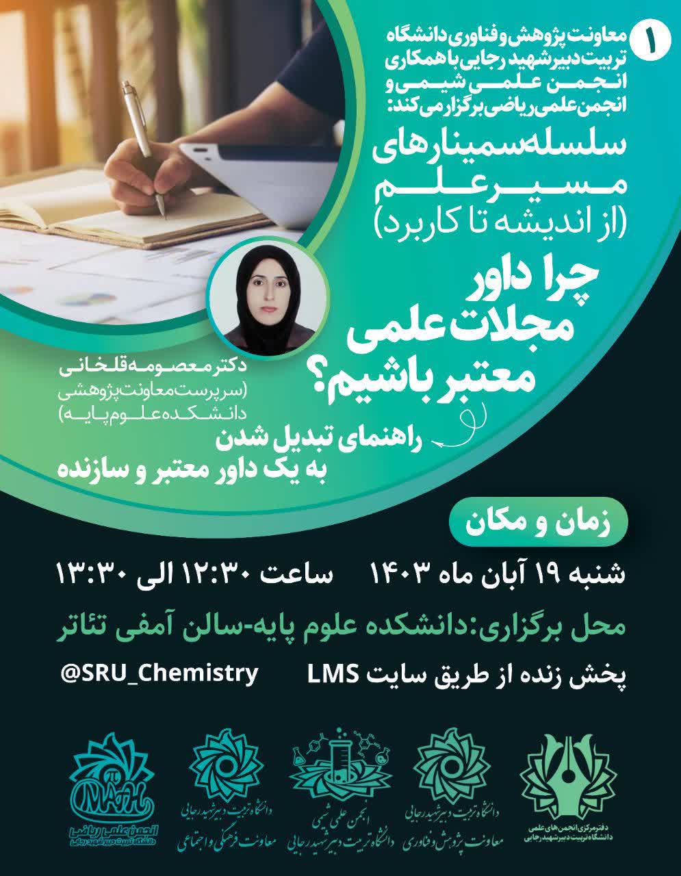 با همت معاونت پژوهش و فناوری دانشگاه تربیت دبیر شهید رجایی و با همکاری انجمن های علمی دانشجویی شیمی و انجمن علمی دانشجویی ریاضی برگزار می گردد :