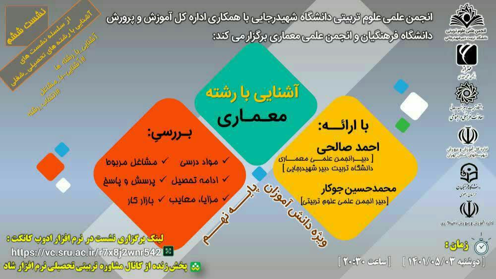 🔹 انجمن علمی علوم تربیتی با همکاری انجمن علمی معماری دانشگاه تربیت دبیر شهید رجایی، اداره کل آموزش و پرورش و دانشگاه فرهنگیان، برگزار می کند: