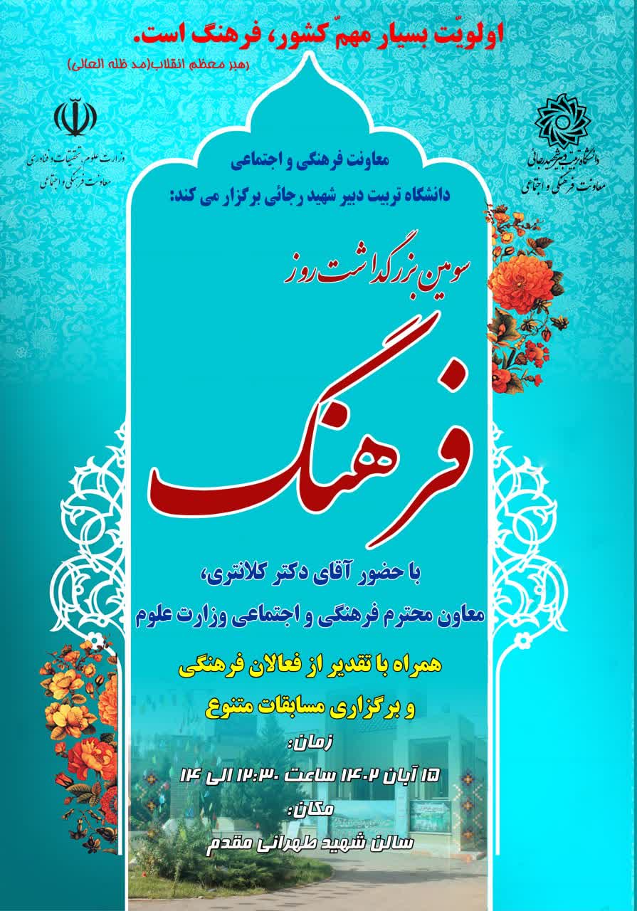 همه چیز مترتّب بر فرهنگ است. فرهنگ حاشیه و ذیلِ اقتصاد نیست، حاشیه و ذیلِ سیاست نیست، اقتصاد و سیاست حاشیه و ذیل بر فرهنگند.معاونت فرهنگی و اجتماعی دانشگاه تربیت دبیر شهید رجایی برگزار می کند:
