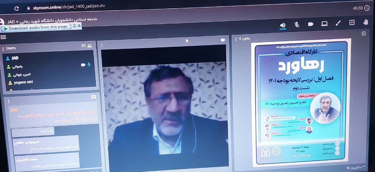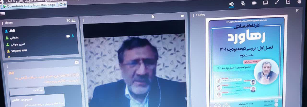 به گزارش کارشناس مسئول معاونت فرهنگی دانشگاه به همت جامعه اسلامی دانشجویان دانشگاه تربیت دبیر شهید رجایی سومین نشست از کارگاه اقتصادی ((رهاورد ))بصورت وبینار با موضوع بررسی لایحه بودجه ۱۴۰۱ با حضور دکتر غلامحسین رضوانی (عضوکمیسیون تلفیق مجلس ) با حضور تعداد ۳۵ نفر از مخاطبین از ساعت ۲۱ به مدت ۱ ساعت در روز جمعه ۲۰اسفند ماه ۱۴۰۰در بستر فضای مجازی برگزار شد.